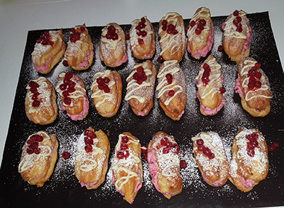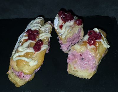 30 g weiße Schokolade mit 1 EL Öl schmelzen, und mit einem Spritzbeutel über die Éclairs spritzen.