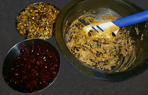 200 g grobe Walnusskerne, 200 g kandierte Kirschen oder Cranberrys halbiert, 100 g kandierte Früchtemix .