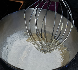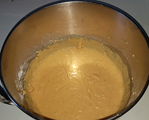 und mit der Milch zur Butter-Ei-Mischung geben und kurz glatt rühren.