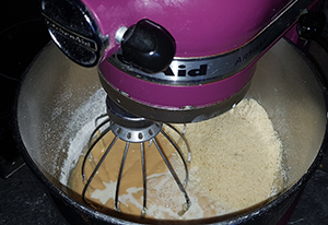 Mehl mit Backpulver über die Ei-Mischung sieben, Salz und Mandeln zufügen,-