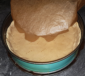 mit Backpapier auflegen, mit Hülsenfrüchten beschweren und 10 Minuten blindbacken,