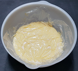 die Butter und die eingeweichte Gelatine hinein rühren, mit Klarsichtfolie abdecken, und abkühlen lassen.