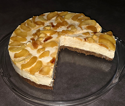 so lange rühren bis die Flüssigkeit aufgesogen ist, anschließend die Apfelscheiben auf der Torte verteilen,