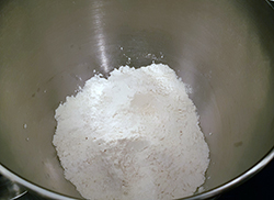 Für den Teig, zuerst: 130 g Mehl, 70 g Zucker, 1 TL Backpulver, 1/4 TL Natron und 1 Prise Salz