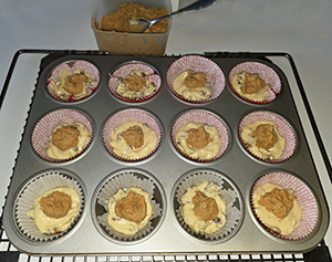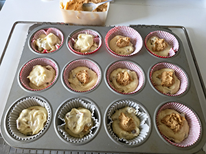 Förmchen zu ½ mit Teig füllen, 1 TL Karamellcreme in die Mitte geben