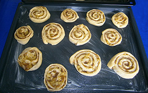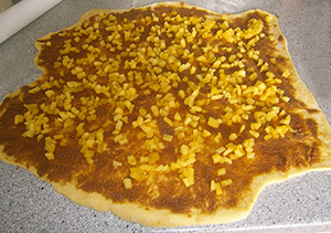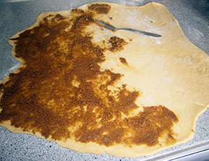 weiche Butter mit braunem Zucker und Zimt vermischen, den Teig damit bestreichen.