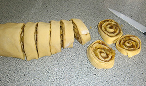 Von der langen Seite her aufrollen und in ca. 2 cm dicke Scheiben schneiden.