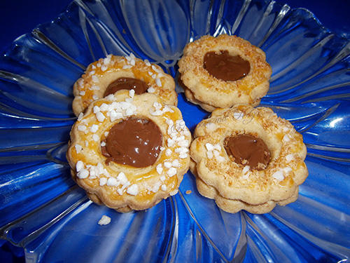 die gelochten Plätzchen leicht aufdrücken und in das Loch noch etwas Nougatmasse einfüllen und trocknen lassen.
