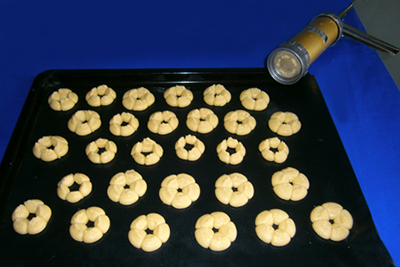 Den Teig in eine Gebäckpresse füllen und Kringel auf ein mit Backpapier belegtes Backblech setzen.