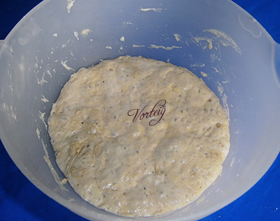 Vorbereitung: Alle Zutaten zu einem Teig kneten und zugedeckt bei Raumtemperatur für 12 Std. gären lassen.