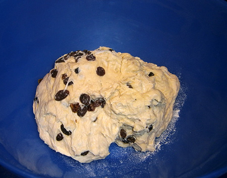 Diese Flüssigkeit in das Mehl geben und mit den Rosinen gut verkneten.