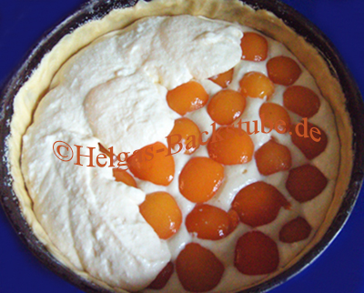 ca. 12 EL = 480 g Quarkmasse darin glattstreichen, Aprikosen darauf verteilen,