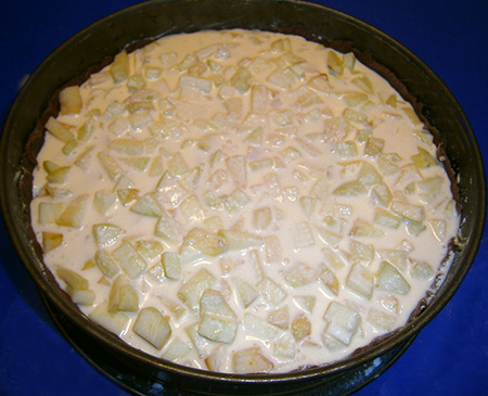 Den Teig in eine mit Fett und Paniermehl bestreute Springform, Randhoch verteilen. -zur Seite stellen.