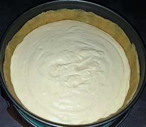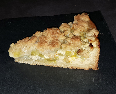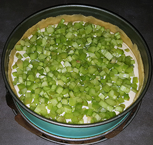 Creme auf den Teigboden streichen. Rhabarberstücke gut abtropfen lassen, auf die Creme verteilen.