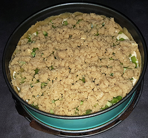 Alle Zutaten mit den Händen zu Streuseln verarbeiten und über den Rhabarber streuen.