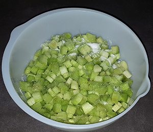 Für den Belag: 600 g Rhabarber (Netto Gewicht 550 g), geschält und in ca. 1 cm Stücke geschnitten