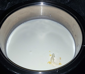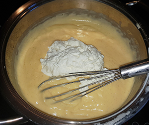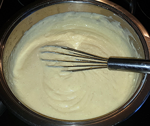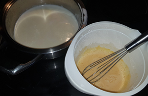 Heiße Milch-Sahne-Mischung langsam einrühren, dann zurück in den Topf geben.
