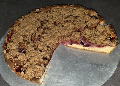 Die Zimtstreusel großzügig über die Pflaumen streuen.