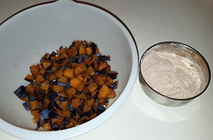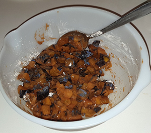Pflaumen entsteinen, klein würfeln, mit Zucker, Zimt und Stärke mischen, kurz ziehen lassen.