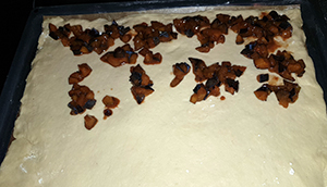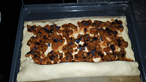 Teig auf ein Backpapier,-ca. 30 × 40 cm ausrollen. Pflaumenfüllung gleichmäßig darauf verteilen.