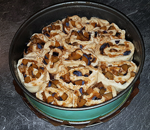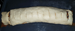 Von der langen Seite her aufrollen, in 12 -13 Stücke schneiden, a`ca. 3 cm dick.