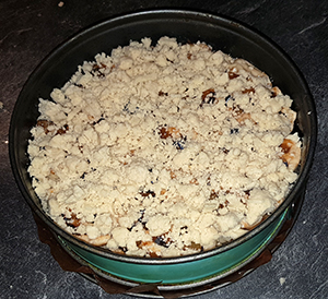 Schnecken auf ein mit Backpapier belegte Springform von außen nach innen legen, mit Streuseln bestreuen.
