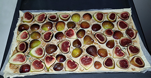 Zwiebeln und Feigenhälften darauf verteilen, Guss darüber gießen, und bei