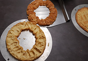 den großen Brandteigring 1x waagerecht halbieren, mit der Vanillecreme füllen, Deckel aufsetzen-zur Seite stellen.