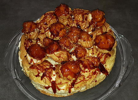 Die Oberseite (Deckel) der Windbeutelchen in Karamell tauchen, auf die Torte mit Karamell befestigen (wirkt wie Kleber).