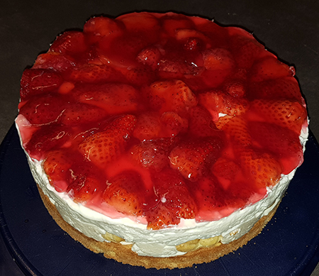 Tortenguss nach Anleitung zubereiten-über die Erdbeeren verteilen- Torte kühl stellen.