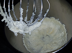Zucker, Fett und Eier zusammen cremig schlagen.