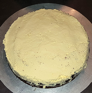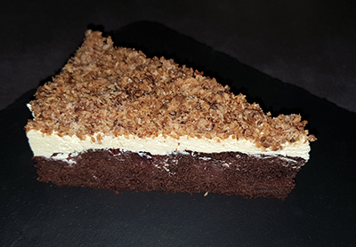 auf den erkalteten Kuchen verstreichen, abgekühlte Kokosstreusel („Späne“) oben drauf verteilen,
