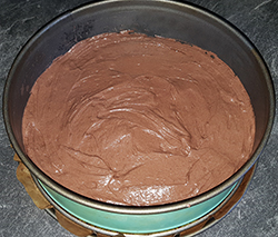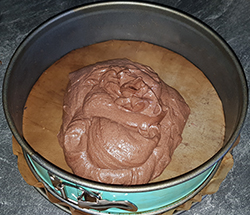 Den Teig in eine mit Backpapier eingeklemmte Springform verteilen,