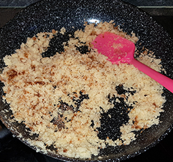 Rühren bis die gewünschte Bräune erreicht ist, anschließend in einen Teller umfüllen, und