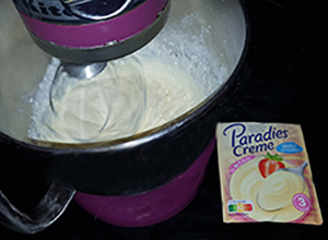 Für die Creme: 200 g Sahne, 200 g Schmand, 1 Pck. Paradiescreme (Vanille)