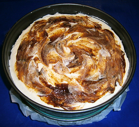 Einige Klekse Pflaumenmus mit einem Teelöffel Klekse auf die Quarkmasse geben. Anschließend