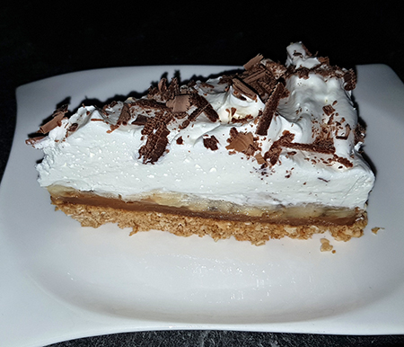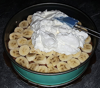 Bananenscheiben in 1 cm dicke Scheiben schneiden und auf die karamellisierte Kondensmilch verteilen.