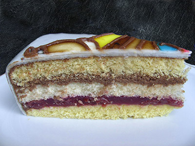 Nougatsahne mit Sahnesteif, steif schlagen, auf die restlichen Biskuit streichen, beliebig garnieren.