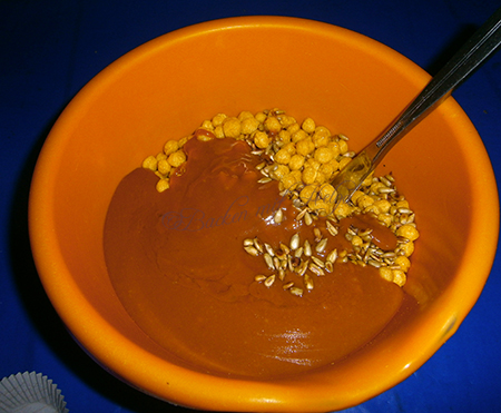 Sonnenblumenkerne in einer Pfanne ohne Fett rösten. Butter mit den Karamellen in einem Topf