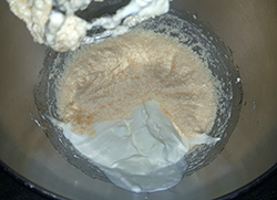 Eier, Zucker, Vanille, weiche Butter und Schmand cremig verrühren.