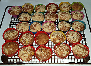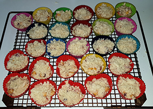Teig in die Förmchen füllen, Streusel darüberstreuen.