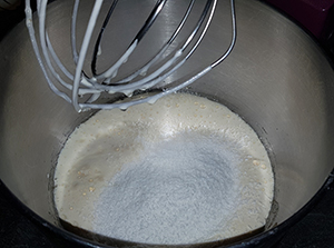 Eier, Zucker und Vanillezucker zusammen schaumig rühren.
