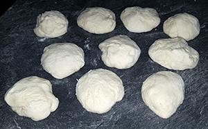 den Teig nochmal auf einer bemehlten Arbeitsfläche kurz durchkneten und in kleine (60-90 g) Stücke abzupfen,