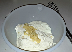 Für die-Knoblauchsoße: 200 g Schmand, 200 g saure Sahne, 1 TL Zitronensaft,